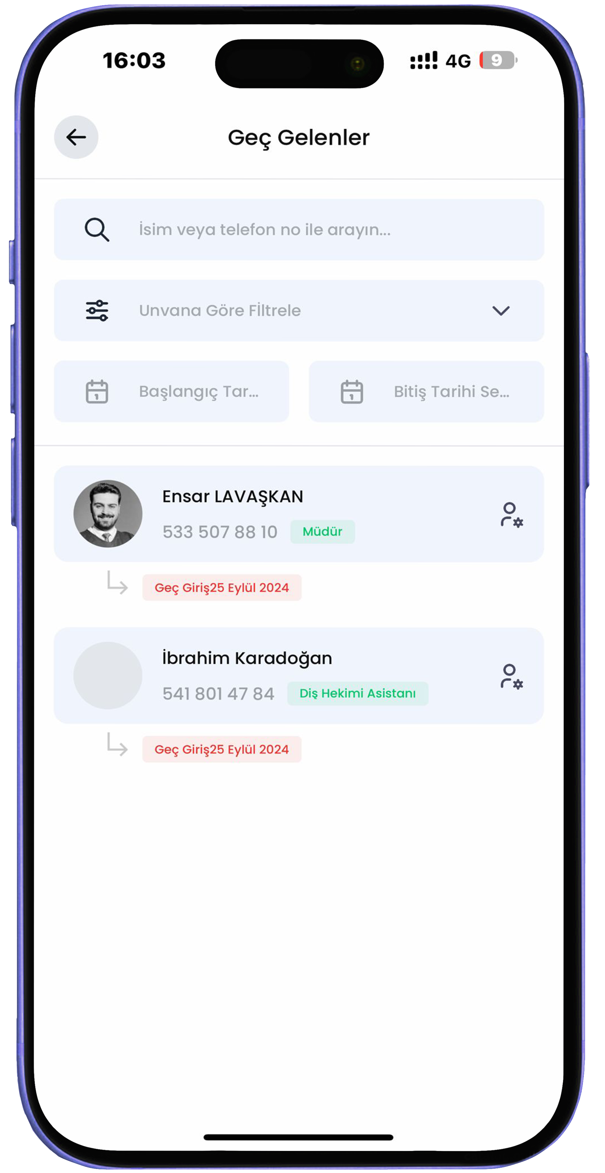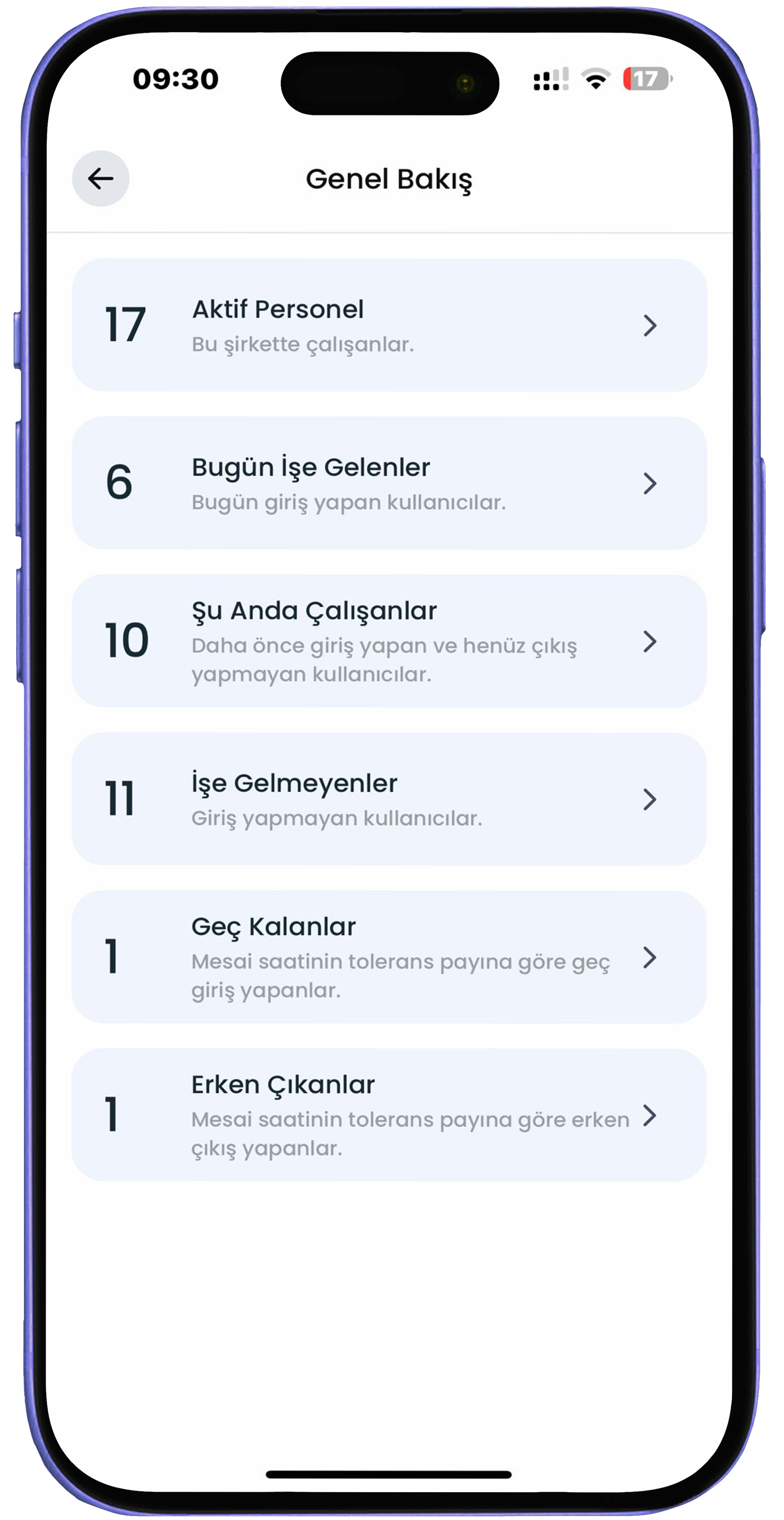 Genel Raporlama Genel Bakış raporlama sistemi sayesinde, gelmeyen personel, tölerans payına göre geç gelen veya erken çıkan personelleri görüntüleyerek hızlı aksiyon alabilirsiniz.